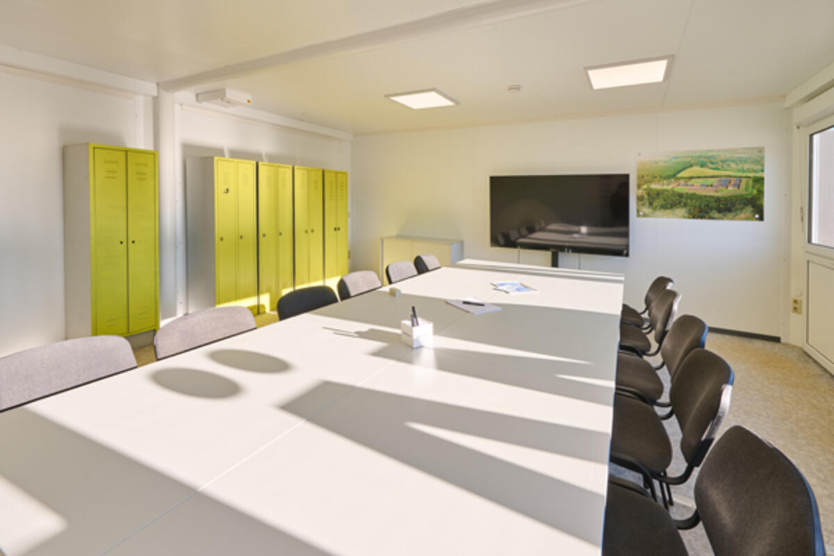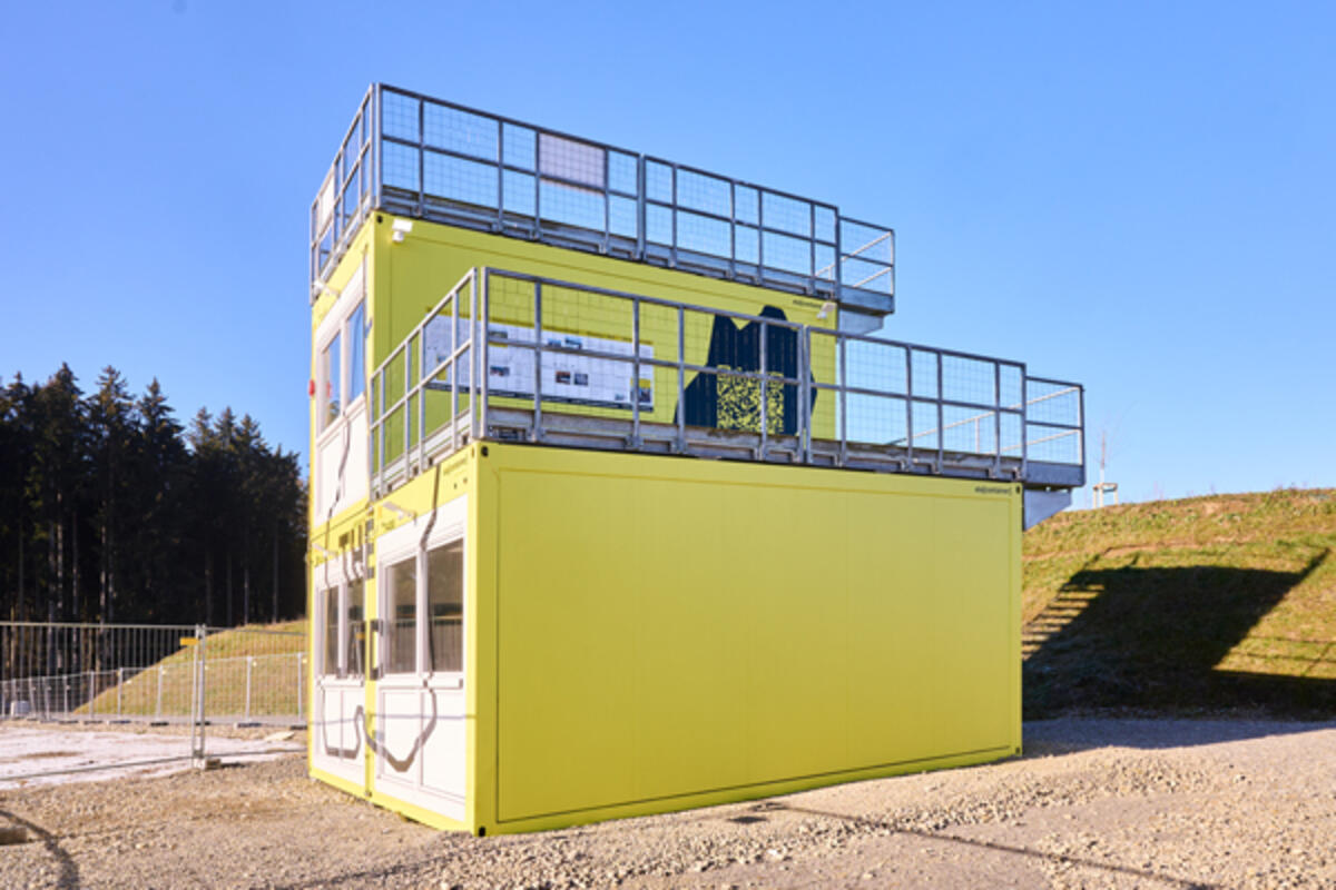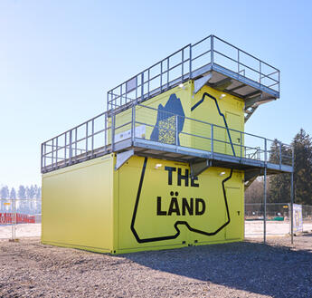 Rotzinger zegt dat de samenwerking met de klant uitstekend verliep, bijvoorbeeld bij de toepassing van speciale vereisten voor het buitendesign. Het kleurenschema voor de ELA-ruimtemodules in zwavelgeel en speciale decals met een logo en grafische elementen weerspiegelen het communicatiedesign van THE LÄND-campagne. De twee verdiepingen zijn door middel van stalen buitentrappen met elkaar verbonden. Witte wanden, grote ramen en een ledverlichtingsconcept zorgen voor een lichte, gezellige binnenruimte. ELA Container leverde ook de elektrische installatie, verwarmingstechnologie, brandbeveiligingsvoorzieningen en rookmelders. Het interieur is uitgerust met tafels, beklede stapelstoelen, archiefkasten, dubbele lockers, banken en kasten.